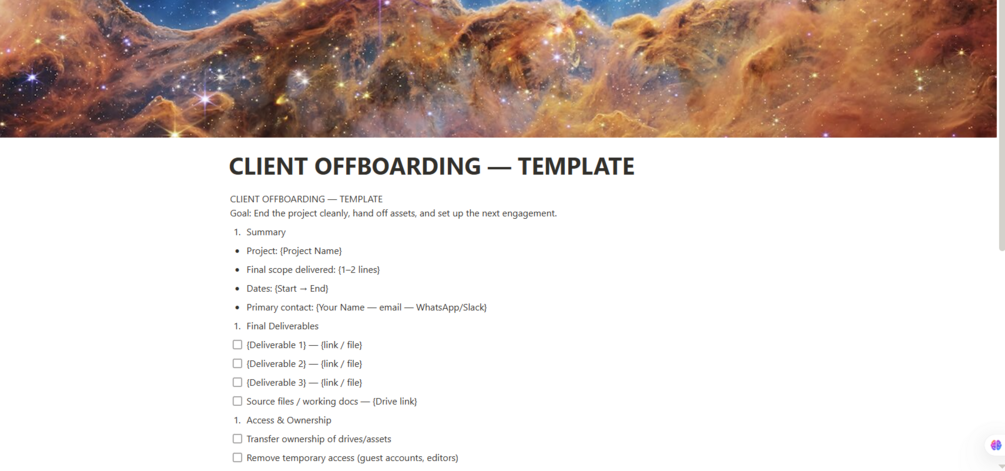 If your first week with a client feels scattered (files, scope, dates), this Notion OS fixes that. You’ll share one clean portal on day one, collect everything with a 10–12 minute intake, and run a tight 30-minute kickoff.